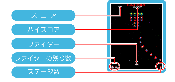 「ファイター」(戦闘機)を左右に操作して、異星人「ギャラガ」をミサイルで撃破してください。攻撃中のギャラガや、編隊を組んだボスを倒すとスコアが上がります。