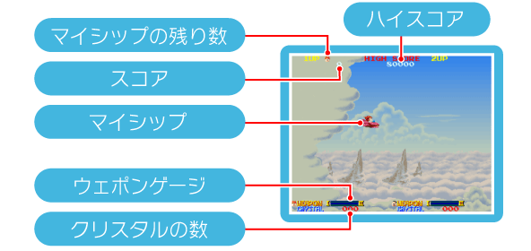 プレイヤーはマイシップを操作し、「ボム」や「ビーム」で敵を倒しながら、空中、洞窟、水中など、全7ラウンドを進みます。また、を押しつづけると連射となります。