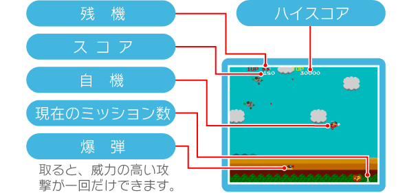 ※ 2人プレイ時で一方がきりもみ状態のとき、もう一方がきりもみ状態の機体を攻撃すると、復帰させることができます。