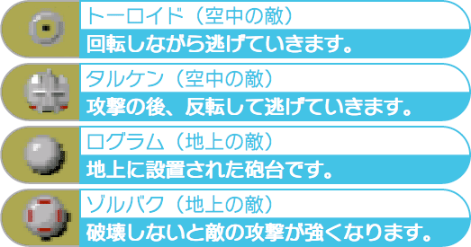 空中の敵はザッパー(空中攻撃)で、地上の敵はブラスター(地上攻撃)で攻撃できます。地上の敵はソルバルウの照準を合わせ、赤く点滅した時にブラスターを撃つことで攻撃できます。また、