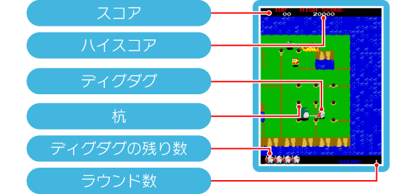 モンスターの攻撃に当ったり、島から落ちるとミスになり、ディグダグの残り数が1減ります。