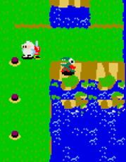 を押すと、ディグダグが向いている方向に、ドリルでヒビを入れることができます。ヒビをつなげると島が分割し、面積の小さい方の島が海に沈みます。
