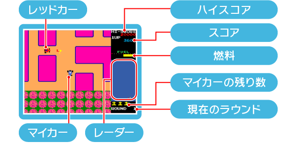 レッドカーや岩に当たるとミスになり、マイカーの残り数が1つ減ります。残り数が0のときにミスをするとゲームオーバーです。