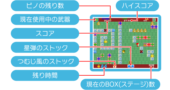 で敵を攻撃しながら、制限時間内に瓶に入ったハートを集めましょう。4つ集めると扉が開き、入ると次のボックス(ステージ)へ進む事ができます。また、