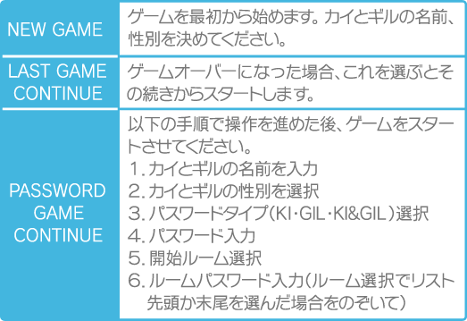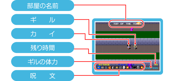 カイは敵に触れると一撃で、ギルは体力がゼロになった時点で戦闘不能となります。どちらかが戦闘不能になるとゲームオーバーです。