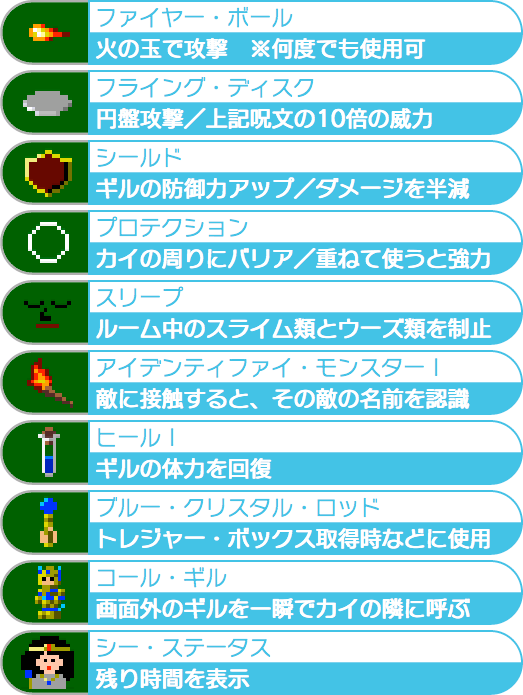 このゲームは「ドルアーガの塔」の続編です。ドルアーガから奪い返したブルークリスタルロッドを持って塔から脱出してください。カイとギルの協力プレイゲームですが一人でもプレイ可能です。大部分はカイが敵と戦いながら鍵を手に入れて、コールギルの呪文でギルを呼び、二人一緒に次の部屋へとすすんでいきます。塔から脱出するとゲームクリアです。中にはギルでないと倒せない敵もいます。