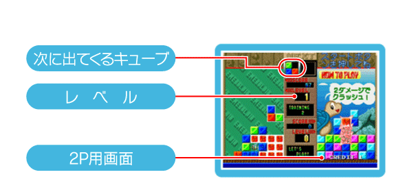 青いイルカとピンクのイルカの対戦モードです。一定数のキューブを破壊すると、おじゃまキューブを送り込んだりして、相手の邪魔をすることもできます。