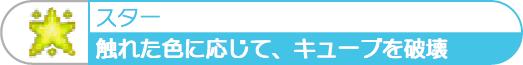 で回転させながら、同じ色のキューブを上からぶつけると、キューブにヒビが入ります。ヒビの入ったキューブにもう一度同じ色のキューブをぶつけると、ヒビの入ったキューブを崩す事が出来ます。