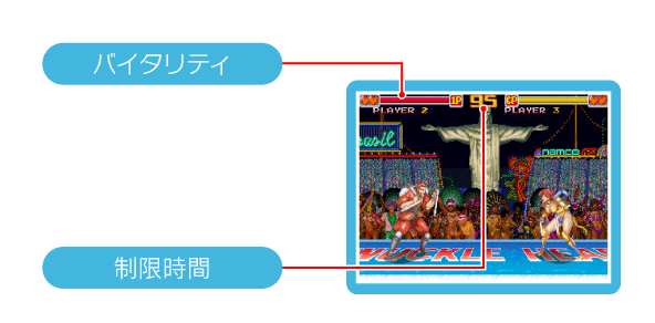 制限時間内に対戦者のバイタリティ(体力)を0にすると1ラウンドを獲得し、先に2ラウンドを獲得すると勝者になります。