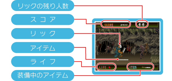 主人公の「リック」を操作し、次々に襲いかかる怪物を倒しながら7つのステージを進みます。