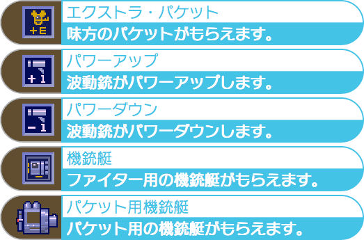 敵や敵の攻撃に当たるとミスになり、ファイターの残り数が1減ります。機銃艇に乗っている場合は、攻撃に当たると機銃艇のみが破壊されます。
