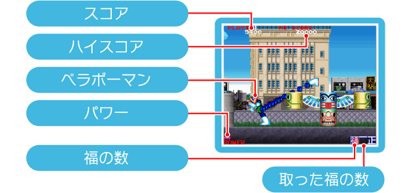 プレイヤーは「ベラボーマン」を操作して、悪の天才科学者「爆田博士」の魔の手から新田四丁目を救ってください。
