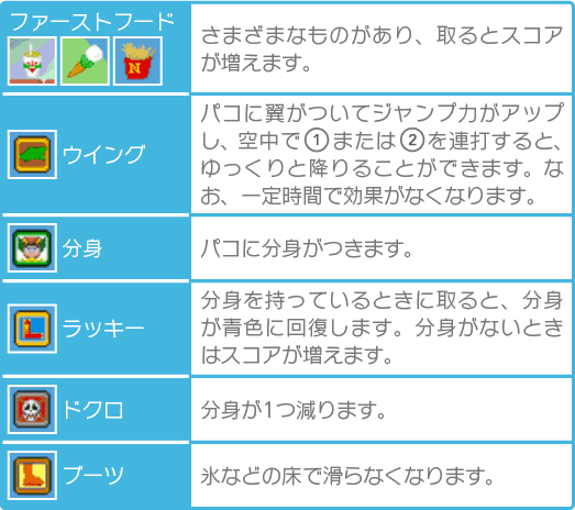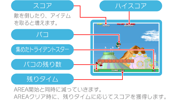 マーベルランドは4つのWORLDにわかれています。各WORLDには複数のAREAがあります。パコを操作し、AREAのゴールをめざしてください。