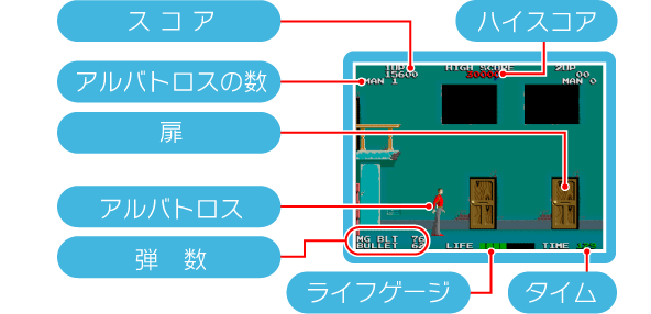 ライフゲージがなくなるとミスになり、「アルバトロス」を1人失います。タイムが0になっても1人失います。