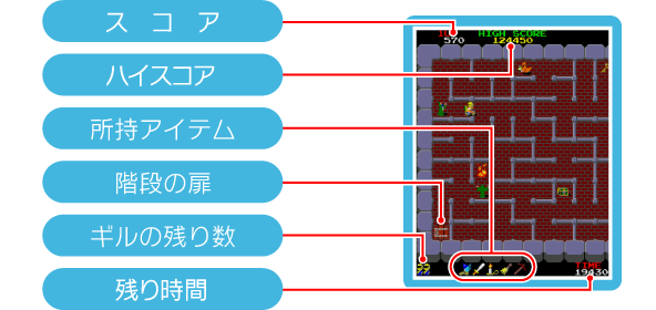 「敵から一定以上のダメージを受ける」「呪文を盾以外で受ける」「炎に触れる」「残り時間が0になる」などするとミスになり、ギルの残り数が1つ減ります。残り数がないときにミスをするとゲームオーバーです。