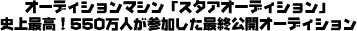 | 株式会社ナムコは、アホポンプロジェクト(株式会社アミューズ、株式会社ホリプロ、株式会社ニッポン放送)とのタイアップにより日本全国の“ゲームセンターからスター誕生!”を可能にする本格的オーディションマシン「スタアオーディション」を設置。この最終公開オーディション「第二回超ビッグオーディション」を8月30日(日)、台風の合間をぬって都市型テーマパーク「ナムコ・ワンダーエッグ2」(東京都世田谷)にて開催し、グランプリ(1名)が決定しました。 |