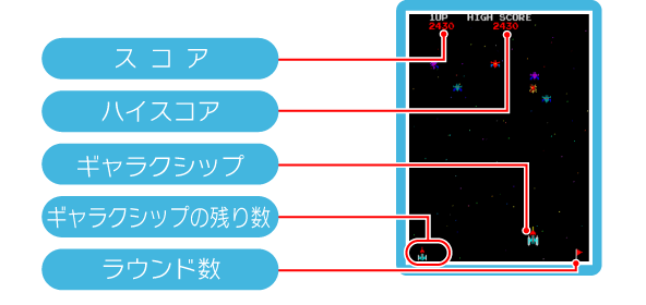 ギャラクシップの残り数が0機の状態でミスをすると、ゲームオーバーです。