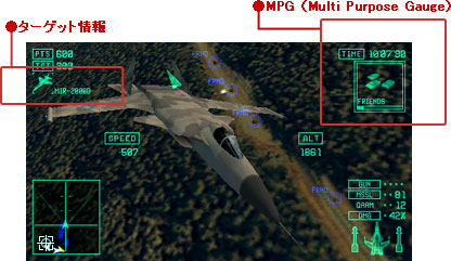 ●ターゲット情報 現在ロックしているターゲットの機種・撃墜ポイントなどの情報を、パイロットに伝える。 複数の敵が出現した場合に、どれを優先的に撃破するか、判断の決め手になる。