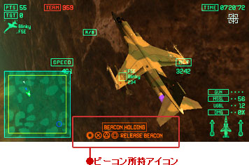 ●ビーコン所持アイコン ビーコン戦では、自分がビーコンを所持していることを示すビーコン戦専用のアイコンが画面に表示される。 ビーコンを所持していると動きに制約を受けるため、時には画面の表示に従ってビーコンを手放すことも戦略となる。