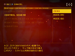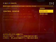 『ACE-ZERO』では、オプションにてコントローラの操作方法を細かく設定できるようになっている。 それが“コントロール・スキーム”だ。 前作『ACE5』では“□ボタン”で索敵レーダー表示、“SELECTボタン”で兵装の選択を行っていたが、『ACE-ZERO』では数種の操作方法の中から任意に選択できるのだ。 周囲の状況を把握する為のレーダー表示を重視するプレイヤーには、「ACE5タイプ」(□ボタン:索敵レーダー表示変更/SELECTボタン:兵装選択)、ドッグファイト中の特殊兵装への素早い切り替えを重視するプレイヤーには「ZEROタイプ」(□ボタン:兵装選択/SELECTボタン:索敵レーダー表示変更)がお薦めだ。 特に敵エースとの激しいドッグファイトで効果的なのが「ZEROタイプ」。 操縦の一瞬の遅れが命取りになる極限の戦闘でこそ、真価を発揮するキーアサインだ。