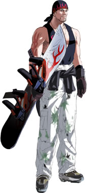 ブラッド・バクスター (Brad Baxter) 通称B.B. 無骨なアメリカ人。元刑事。ストリートの悪がきどもには慕われていたが、潜入捜査に失敗して閑職に回されたのをきっかけに退職し、何故かスノーボーダーとなる。 悪っぽいがいい奴。粗野でがさつで乱暴な印象を受けるが、割と気さくで根は優しく、外見から取れるイメージほど乱暴ではない(でも、粗野でがさつなのは見たまま)。 声がでかく、豪快に酒を飲み、豪快に笑う。体重は重いが性格は軽めでちょっとスケベ。刑事時代に体を鍛えていただけあってすごい筋肉。しかし、退職後に怠けぐせが付いたことと、年齢のせいもあって、見た目とは裏腹に腰などに大分ガタが来ている。最近、肩こりが気になる。 |
