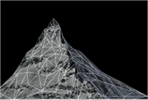 いずれのコースも、ヨーロッパに実在するゲレンデを、衛星データと現地取材により忠実に再現したものです。この写真は、山を様々な角度から撮影し、そのデータを入力するという手法でポリゴンモデルを作成しているところです。 |