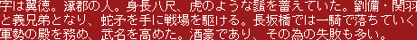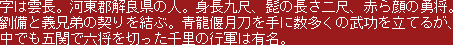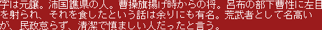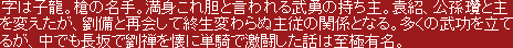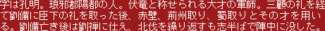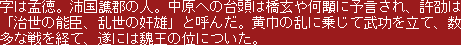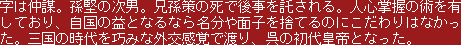 字は伯符。孫堅の長男。孫堅死後、伝国の玉璽を質に袁術から兵を借り、劉[月缶系]や厳白虎を討つ。献帝を得ようと兵を挙げようとしたが、許家の食客に襲われ重傷を負う。于吉の幻が傷を悪化させ落命、後事を孫権に託す。