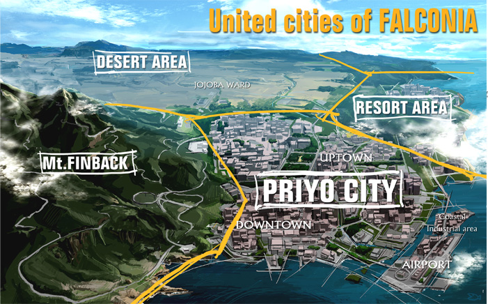 ゲームの舞台となる「プリヨシティ」は、南北約8km、 東西約9kmの広大なマップで構成され、 様々な顔をあわせもっています。