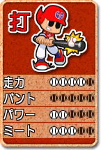 打撃スキルを変化させるカードです。このカードを使うことによって、ミート、パワー、バント、走力のスキルが変化します。 なお、勝負強さは打カードでは変化しません。 |