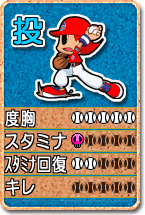 投球スキルを変化させるカードです。このカードを使うことによって、度胸、スタミナ、スタミナ回復、変化球のキレのスキルが変化します。 なお、投球スキルのない選手に投カードを使うことはできません。 |