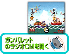 | ラジオCM プレイステーション 『ガンバレット』30秒発売前編 S E / BGM&エコー 女店員 /『ようこそ、夢の射的場へ。いらっしゃいませ。恋にしますかそれとも愛を?』 男 客 /『 あ、愛を…。』 女店員 /『上級コースですね。かしこまりました。一発でも的をはずすとと命取りになりますが…、よろしいですか?』 N A / プレイステーション極楽射的ゲーム『ガンバレット』8月7日発売。 S E /ドッキューン…。(銃声) 女店員 / アァ〜ン… 、めいちゅう(命中)…(エコー)。 C I /NAMCO |