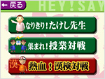 決められた時間割で、「授業前の挨拶」「たけし先生のコメント」「例題」「ホームルーム」など実際の番組進行に沿って、問題を解くメインモード。 たけし先生のコメントや、おなじみの勉強小僧が進行を行ってくれるほか、わかりやすい例題や解説もモチロン収録! 例題コーナーでは、たけし軍団のみなさんが出演!番組同様、たけし先生との軽快な掛け合いを楽しみながら、問題の意図を掴むことが出来ます。