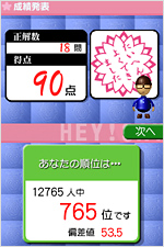全国模試はゲームをプレイしていると出現し、チャレンジ可能になります。 「全国模試」の結果をWi-Fi通信で送信し、全国ランキングに応募しましょう。 全国ランキングとして総合順位・偏差値が集計されます。目指せ!日本一。 もちろん、ランキングには参加せずにテストだけ楽しむことも可能です。 ※ ランキングへの参加は模試終了後直ぐか、後から全 国模試メニューから行うことができます。 ※ ランキングへの参加は1テスト1回のみ可能です。 ※ 再プレイ時の成績でランキングに応募することはでき ません。