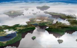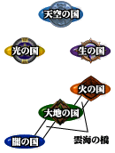 | 6つの国はそれぞれ独立して雲海に浮かんでいる。 神族は6つの国を『門』を使って移動することができるため、自由に行き来ができる。 しかし人間族は「闇の国」「大地の国」「火の国」は『雲海の橋』を使って陸路移動可能だが、他3国については、人間の力だけでは移動できない。 |