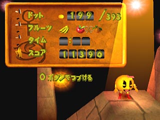 ステージクリア。獲得したドット、フルーツの数が表示されます。