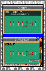 マッチ棒をタッチペンで移動&回転動させて上画面に表示されるの条件を満たすクイズ。