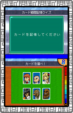 下画面に並んで表示されるカードを覚え、それらのカードが裏返った後に上画面に表示されたカードと同じ絵柄のカードをタッチペンで選択して当てるクイズです。