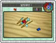 タッチペンで砂をかきわけ、中に埋もれている自分のお宝を発見するゲーム。先に宝を発見できれば勝利です。