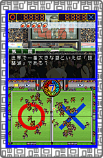 出題される問題の答えが「○」か「×」かを答えるクイズ。タッチペンでキャラクターを「○」もしくは「×」の場所に動かして解答します。
