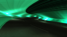 まだ建設中のこのトンネルでは、ジャンプ必至の高い段差が突然襲いかかるので要注意。そしてイエロー、グリーン…とセクションごとに色をかえる近未来的なデザインのトンネルは、うねるようにアップダウンをつけて左右へとカーブし、ハイスピードでドリフトする視線の先に鮮やかな光の流れを描くのです。