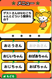 プレイヤー以外の方でも、おじさんやおばさんなどのゲストとなってゲームに参加し、子どもとふれあうことが出来ます。ゲストが教えたことばは、もちろん子どもは覚えていて、育成しているプレイヤーにゲストたちとのふれあいについてお話してくれることもあります。 ※こうたいモードでは、「ふれあいモード」のみプレイ出来ます。