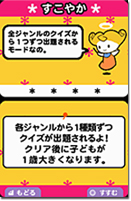 右脳クイズの得意ジャンルによって、子どもの性格や外見(おおらか、しっかり、こだわり、わんぱく)が変わります。どんな子に成長するかはあなたの右脳次第!