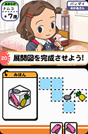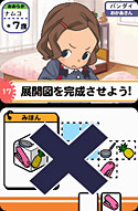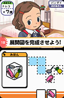 見本の立方体を見ながら、その展開図に足りないものを選択肢の中から選び出し、正しい場所に当てはめる右脳クイズです。